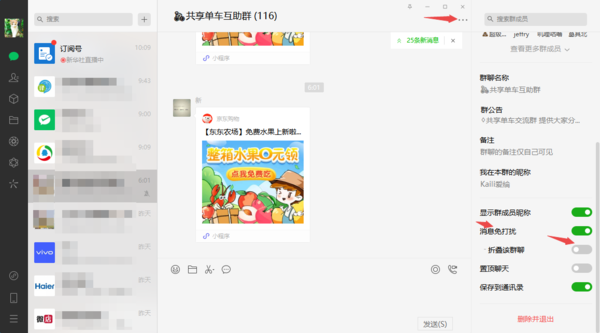 首先,我们找到并打开设置了免打扰的群,然后点击群聊窗口右侧的【...】三个点图标。接着在右侧的窗口中,找到【消息免打扰】下的【折叠该群聊】功能,并将该功能的开关滑动打开。
