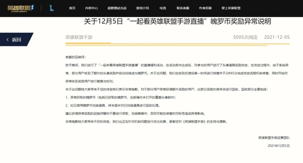 12月4日,英雄联盟推出了一个活动叫:“一起来看英雄联盟手游直播”的活动,参与玩家条件达成后会发放头像奖励,发放过程中,系统出现了异常,部分用户收到了额外的头像奖励并且自动兑换成为魄罗币。很多玩家因为这个BUG获得了大量的魄罗币,官方也当即在2点45分完成修复了这个问题,也会收回多发放的额外奖励,另外,官方建议获得异常奖励的玩家现在不要进行领取和兑换,要不然可能在修复时对账号造成异常影响。关于这样的BUG英雄联盟手游已经不止一次了,但其实一个游戏出现BUG也属于很常见的事情,更多要注意的是玩家的体验。