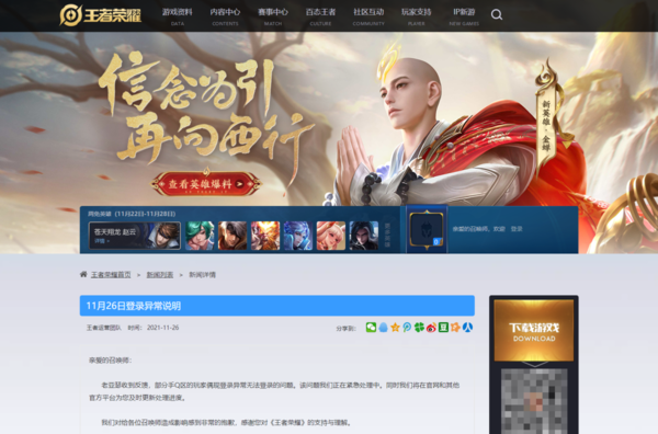 今天王者荣耀游戏出现的崩溃情况,具体的表现为登录异常或者是无法登录的情况。而针对王者荣耀又崩了的问题,目前官方已经在第一时间做出了回应。