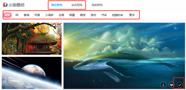 壁纸程序更新完成后,在弹出的窗口中,根据壁纸种类和内容,查找选择想要使用的壁纸,并点击窗口右下角的对勾图标,就能使用对应的图片作为壁纸了。