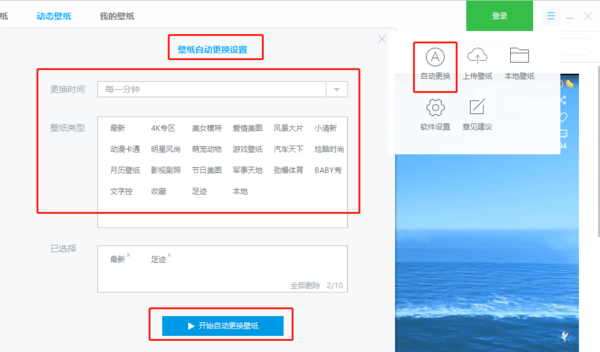 如果不想总是手动更换壁纸,可以使用自动换壁纸功能,在壁纸选择窗口,点击页面右上角的三根横线图标,在出现的选项栏中点击“自动更换”键。在弹出的壁纸自动更换设置中,选择壁纸更换时间、壁纸类型后,点击“开始自动更换壁纸”键就好了。