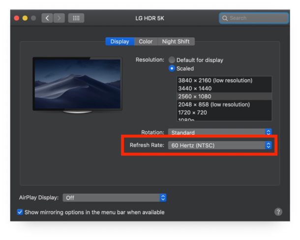 如果您在Mac显示器上看不到更改刷新率的选项,可能是因为您的显示器不支持更改刷新率,或者您在选择缩放分辨率按钮时忘记按住option/ALT键。