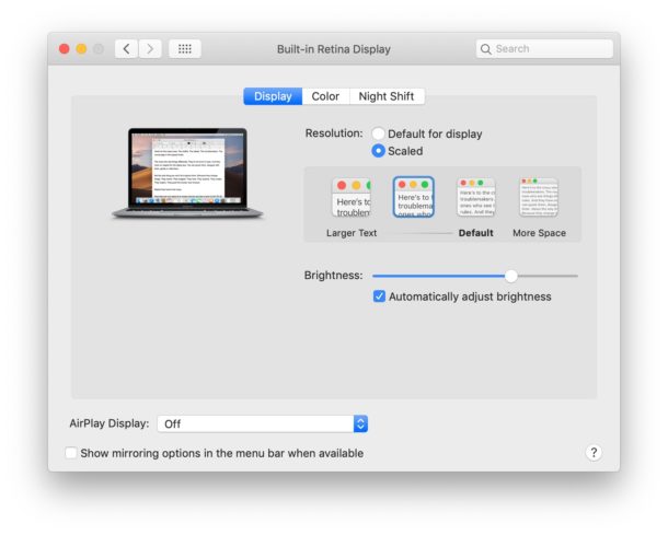 如果你愿意,你也可以在相同的设置菜单中改变视网膜mac的屏幕分辨率,是增加屏幕上的文本大小和内容大小,还是获得更多的屏幕空间。