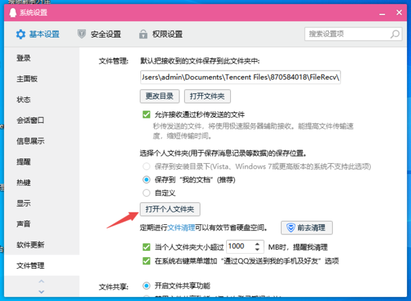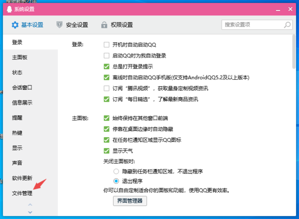 2、接着在弹出的QQ系统设置窗口的左侧列表中,找到【文件管理】选项,并点击打开。