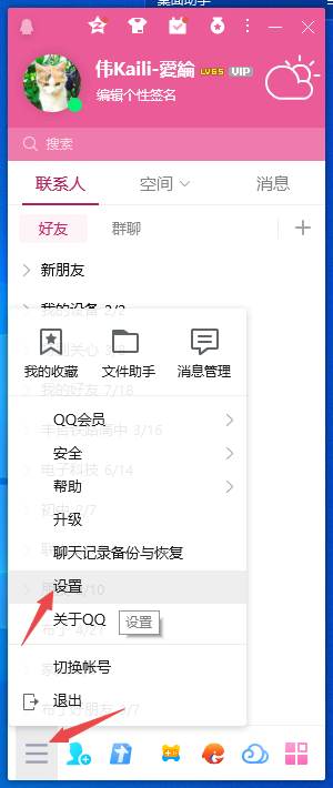 1、打开电脑上的QQ软件,然后点击QQ主界面底部的【三】主菜单按钮,接着在弹出的选项中,选择【设置】选项。
