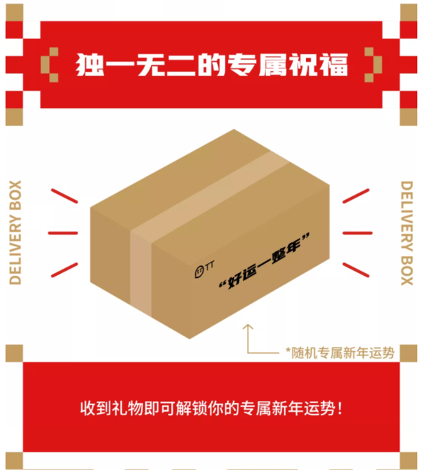 用户收到的礼物盒上,会印有TT语音给每一位VIP用户的专属祝福语,而且祝福语会随机发送,收到礼物就能解锁专属新年运势。