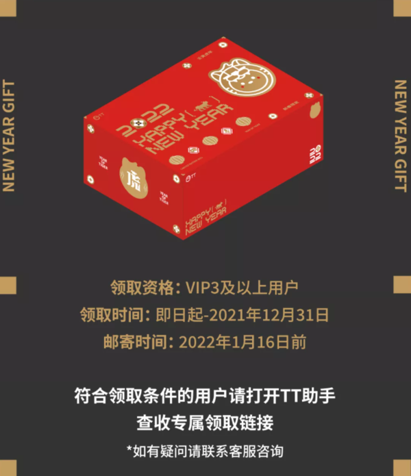 这次TT语音发送的节日礼盒,只有VIP登录达到三级及以上的用户才有,符合条件的用户可以在TT语音助手上,查收系统发送的专属领取链接,在2021年12月31日进行领取就可以了。领取完成之后,TT语音官方会在2022年1月16日前将礼物寄出,领取了礼物的小伙伴要注意查收哦。