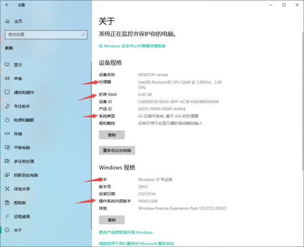 最后,我们便可以在弹出的窗口中,看到自己电脑的处理器、系统类型、机带RAM、系统版本等信息了。