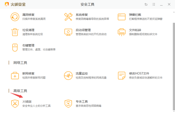 1、打开电脑上的火绒安全软件,接着点击【安全工具】选项,然后找到【火绒剑】功能,并点击它。