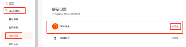 步骤二:跳转到个人中心界面后,在左侧基本操作中选择“绑定设置”栏,页面刷新后,再点击手机绑定栏中的“去绑定”。