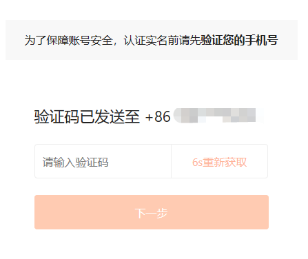 步骤二:实名认证前需要先验证手机号,输入收到的短信验证码,点击“下一步”。
