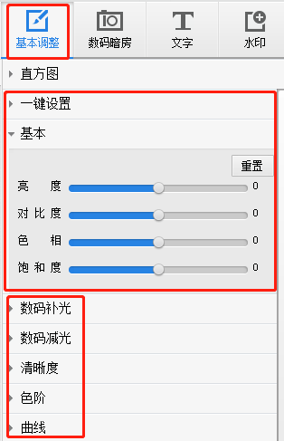 点击页面上方工具栏中的“打开”键,打开需要处理的图片。之后在右侧选择“基本调整”,在一键设置中,可以使用系统编辑好的美化效果。也可以在基本一栏中,自定义设置图片的亮度、对比度、饱和度等。当然了,也还有很多其他的,更专业的调整选项可以设置。