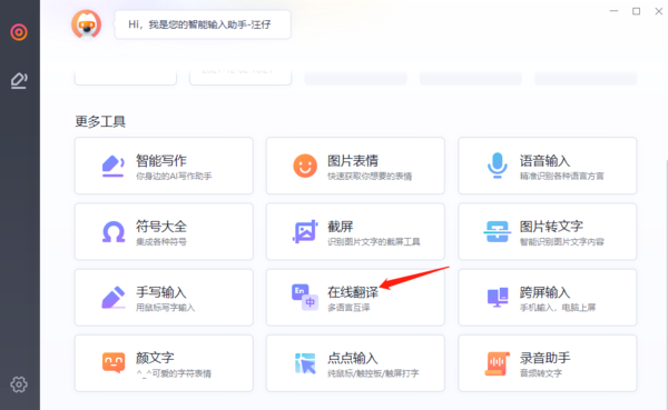 为我们弹出一个常用工具框,里面包含图片表情、语音输入、符号大全等功能,除此之外,我们也可以看到翻译器,只不过它在这个框里叫“在线翻译”。我们点击它,就可以打开翻译器进行使用了。