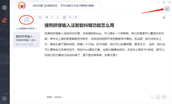在搜狗拼音输入法的状态栏里,同样点击搜狗的logo,弹出菜单框,在常用功能菜单左上角的就是智能写作助手,点击该按钮即可来到智能写作模块。在这里,我们点击左上方,搜狗头像下面的按钮,新建一个文档。在文档里,我们可以创建标题,撰写正文·,当然,我们也可以复制自己在其他地方,例如Word里的文章。当我们编辑完成后,点击右上角的“纠”按钮,就可以对我们的文章进行自动纠错了,可以说是非常简单,非常方便~