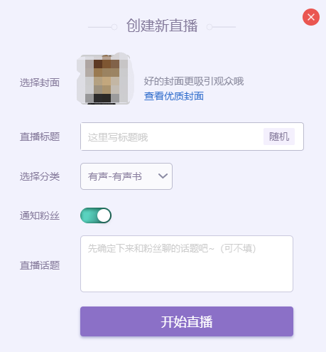 在弹出的创建直播窗口中,设置直播内容封面,编辑好直播间标题和分类,确定完语音直播的话题后,就可以点击“开始直播”键,正式进入语音直播界面了。
