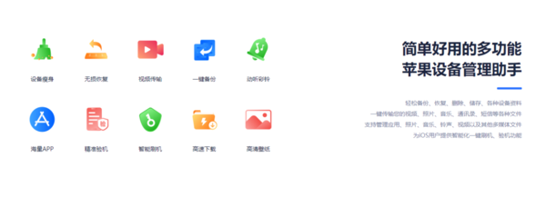1.简单好用的多功能管理助手,轻松备份、恢复各种设备资料文件,支持管理苹果应用、照片、音乐、视频以及其他多媒体文件。