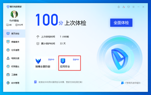 打开电脑上的腾讯电脑管家软件,在软件的首页体检页面的右侧的底部,找到【应用安全】功能,可以看到这个功能右上角为【防护中】的状态。点击它。