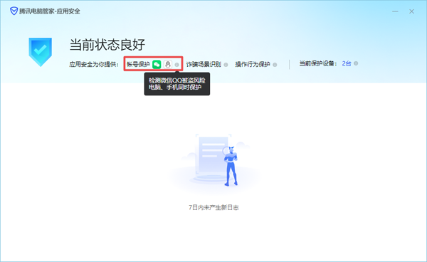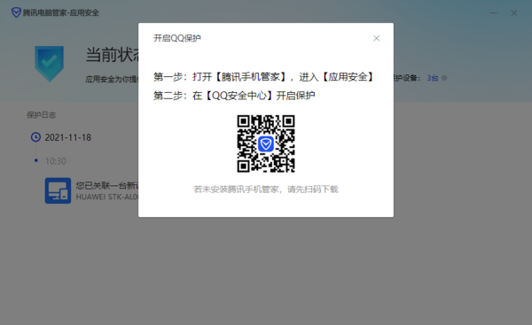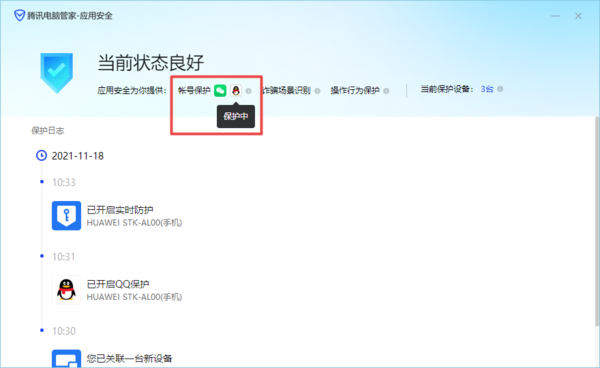在腾讯手机管家上完成盗号保护功能的操作后,回到电脑端的腾讯电脑管家的应用安全界面当中,此时我们可以看到QQ账号的图标被点亮了,同时在下方的【保护日志】当中,可以看到【已开启QQ保护】的信息了。