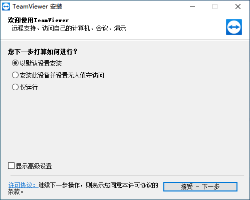 双击打开下载好的TeamViewer软件,然后在弹出的安装窗口中,点击【接受--下一步】按钮。接着,软件就会进行安装了,此时我们只需要耐心等待安装完成即可使用TeamViewer软件来远程控制电脑了。