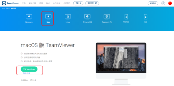 如果你的电脑是苹果系统的话,点击界面顶部的【Mac】,然后点击【MacOS版TeamViewer】下面的【下载】按钮即可。