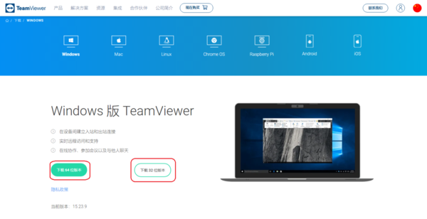 接着,在弹出的下载界面当中,如果你的电脑是Windows系统的话,就点击【Windows版TeamViewer】下的【下载64位版本】或【下载32位版本】,点击那个取决于你的电脑系统是64位还是32位了。