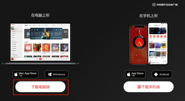 来到下载页面,可以看到官网提供pc端和手机App的下载,如果想下载pc端,则点击左侧的“下载电脑端”,就可以下载网易云音乐pc端了。