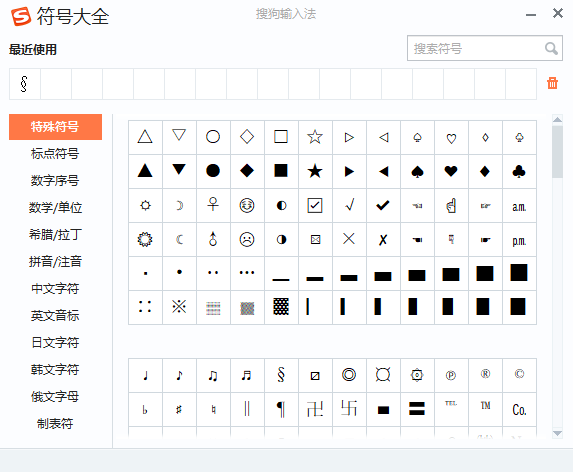 提到符号,那肯定不光是指输入法中日常使用的标点符号,还有其他符号。在搜狗拼音输入法的快捷栏,点击搜狗logo展开菜单栏,点击符号大全即可看到搜狗拼音输入法中的全部符号,在这里我们可以找到一些平时不常用,或是我们需要用但很难用键盘打出的符号,可以借此解决一些“疑难杂症”。此外,一些特色符号也可以利用输入符号的名称来打出。