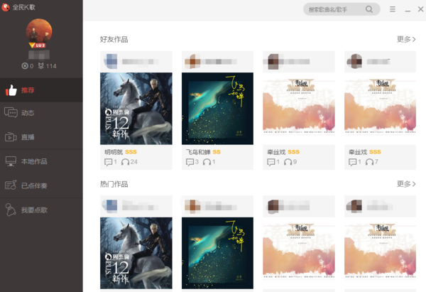 在登录全民k歌电脑版之后,首先映入眼帘的就是推荐界面,在这里我们可以看到有好友最近唱的歌以及一些平台上比较热火的演唱歌曲,点击就可以开始欣赏这些作品了。