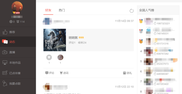 在推荐界面点击“更多”或在左边菜单栏里点“动态”都可以进入动态界面,在动态界面可以通过下拉看到更多好友的动态,可以慢慢品味好友的作品。此外,这个界面的右侧有全国人气榜,也可以点他们的头像,进入其主页,欣赏一下大神的作品。