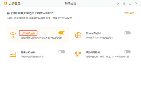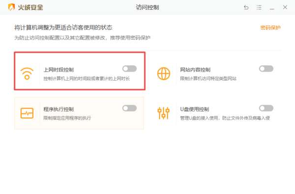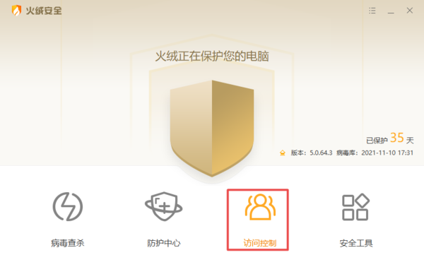 首先,启动电脑上的火绒安全软件,进入软件主界面后,点击【访问控制】选项。然后在弹出的访问控制窗口中,将【上网时段控制】的开关滑动打开,开关变成橘色就代表功能成功开启了。
