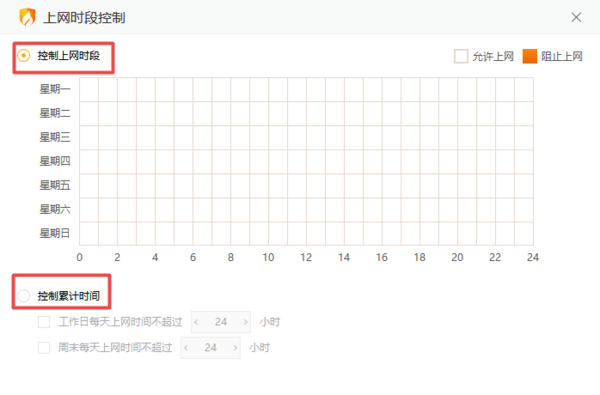 然后,在该界面中,我们便可以根据自己的实际需求,来设定控制上网时段了。而控制上网时段一共有两种方法,一种是通过分时段进行控制,另一种则是通过累积上网时间来进行控制。下面小编详细的为大家介绍这两种设定断网时段的方法。