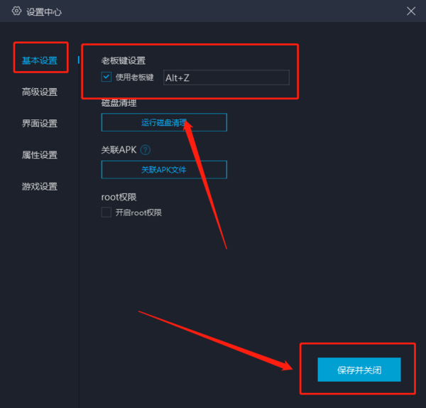 跳转到设置中心界面后,在基本设置一栏中,最上面就是老板键设置,自定义更改好老板键的按键组合后,点击“保存并关闭”就设置完成了。