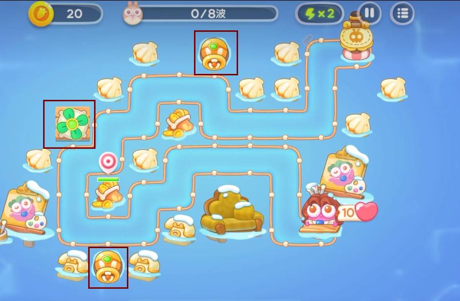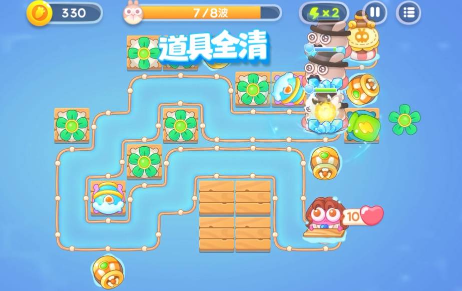3、清除沿路上的建筑后种上雪球、风扇塔和瓶子炮,怪在未到达左边区域时,集中火力消除周边建筑。