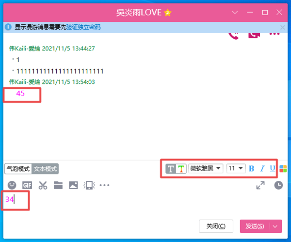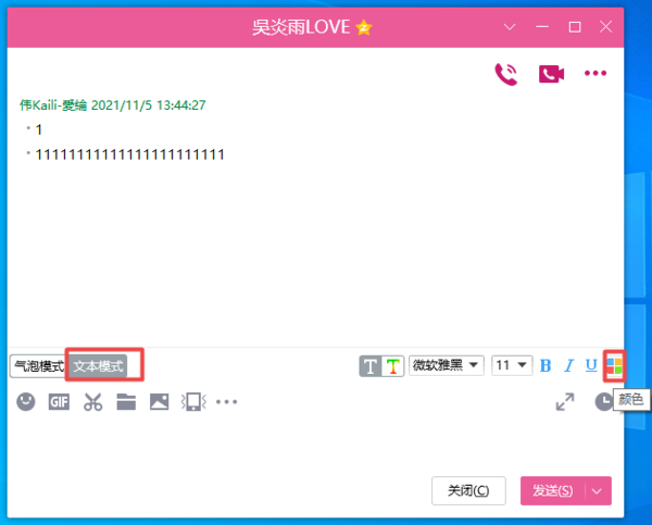 第七步,接着,我们向好友发送消息以及消息发出时,便可以发现聊天字体的颜色就修改好了。