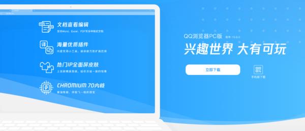 QQ浏览器是由腾讯推出的一款采用Chromium+IE双内核的浏览器,在使用上能让浏览快速稳定,拒绝卡顿,完美支持HTML5和各种新的Web标准。它同时可以安装众多Chrome的拓展,支持微信和QQ快捷登录,同步账号下的书签、皮肤和应用。