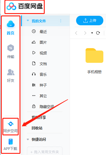 在电脑上打开百度网盘后,登录自己的账号,在主页面左侧,点击“同步空间”图标,就能跳转弹出百度网盘同步空间页面了。
