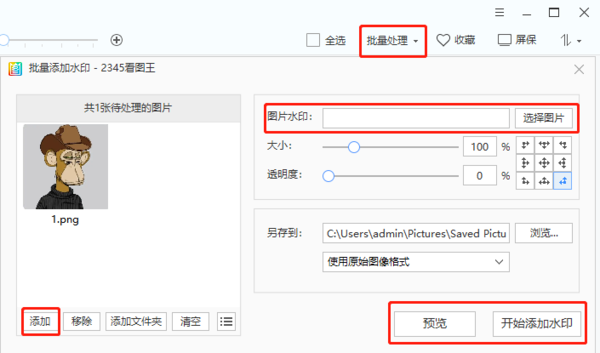 小编这里以批量添加水印为例,打开2345看图王后,点击主页面右上角的批量处理字样,在出现的下拉选项中,选择批量添加水印。在添加水印界面,点击“添加”选择需要添加水印的照片,图片添加完成后,在右侧选择要作为水印的图片。都选择好之后,点击预览查看水印添加效果,没有问题就点击“开始添加水印”就行了。