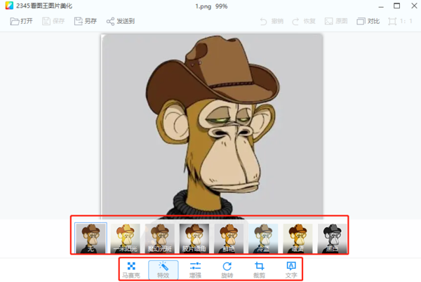 打开2345看图王后,找到需要进行编辑的图片,选中后单击鼠标右键,在弹出的选项框中,选择图片美化功能。跳转到图片美化界面后,在图片下方,可以选择对图片添加特效或者文字,也能剪裁旋转图片。