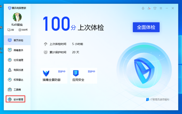 ①打开电脑上的腾讯电脑管家软件,然后点击界面左侧的【软件管理】选项。