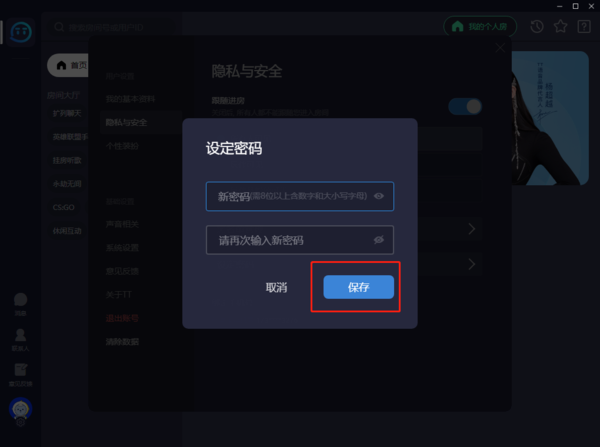 TT语音设定密码的位置在用户设置窗口内的隐私与安全页面内,设置新密码时用户需设定8位以上包含数字和大小写字母的新密码。