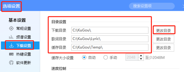2.建议将酷狗下载地址更改到其他磁盘,以免占用C盘空间,影响电脑运行速度。