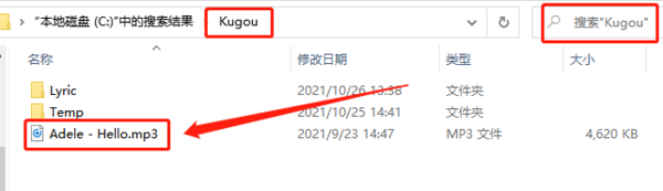 途径二:不需要打开酷狗音乐,直接打开电脑上的资源管理器,搜索“Kugou”文件,找到并打开对应文件夹后,就能找到酷狗下载的音乐了。