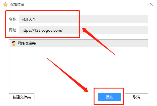 方法二:同样是打开搜狗浏览器后,先搜索转到想要收藏的网址页面,点击页面上方地址栏右侧的五角星图标,也能弹出添加收藏窗口,点击添加就行了。