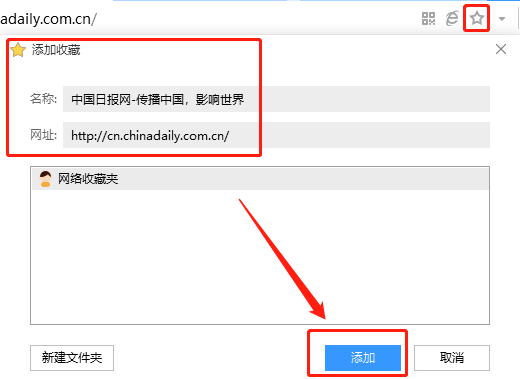 如果遇到感兴趣或者是需要经常浏览的网页,可以点击页面上方地址栏右侧的五角星图标,将网址到添加到收藏夹中,方便再次打开浏览。