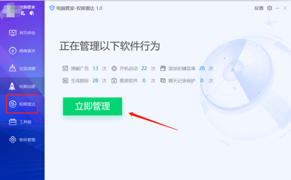 很多小伙伴的电脑中都安装有腾讯电脑管家软件,大家在打开腾讯电脑管家之后可以看到主页左侧有一个权限雷达功能。这个权限雷达最大的作用就是管理软件的行为,接下来小编就为大家介绍一下腾讯电脑管家权限雷达的作用都有哪些!