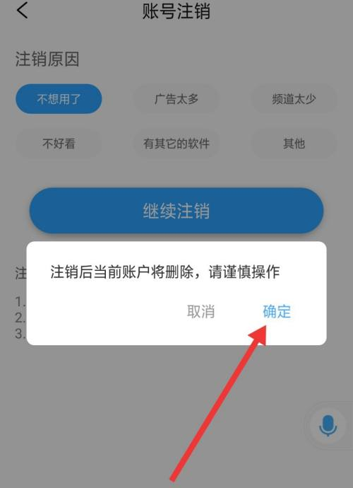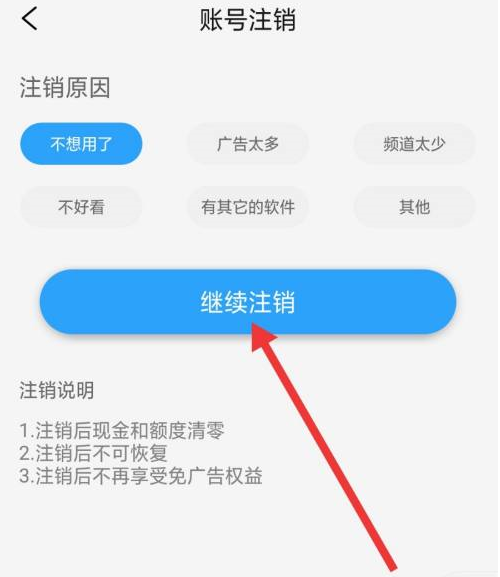 第三步:进入到账号注销界面后,再选择注销原因,点击继续注销。