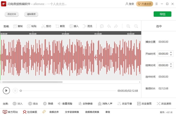 2、风云音频处理大师。风云音频处理大师也是一款操作非常简单的音频剪辑器,但它在操作容易的同时,也具备功能丰富的特性,主要功能有音频剪辑、转换、合并、添加效果等。