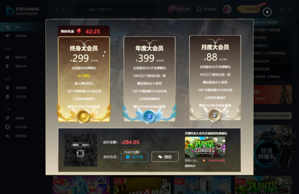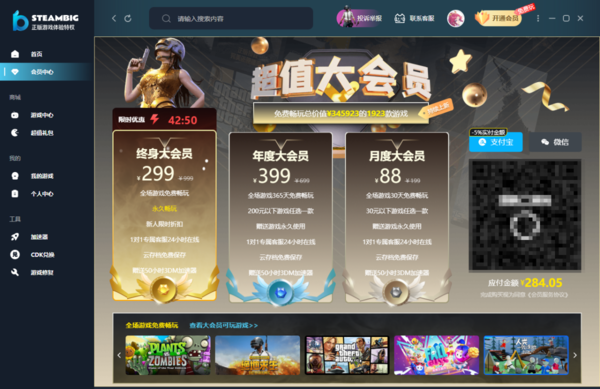 根据财神爷站小编的亲自使用以及查找资料内容来看,目前steambig平台开通永久会员的价格是299元,这个永久会员在该平台上被叫做终身大会员,并且现在还有限时的优惠价格,小编目前看到的限时优惠价格是284.5元。