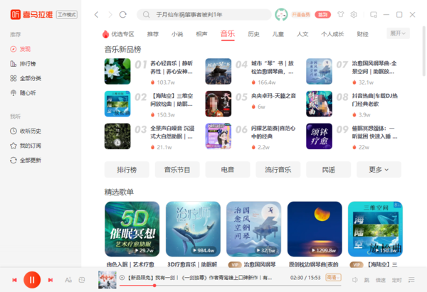 PC电脑版喜马拉雅软件可以进行录音吗?这是最近小编一直收到的问题,同时也是小编最近在使用电脑版喜马拉雅听书软件时也会思考的一个问题,毕竟大部分的时候我们都需要专心的去使用电脑处理工作,而当我们将电脑中喜马拉雅播放的内容录音下来,传到手机上,自己下班后再去听也是一个非常不错的选择。