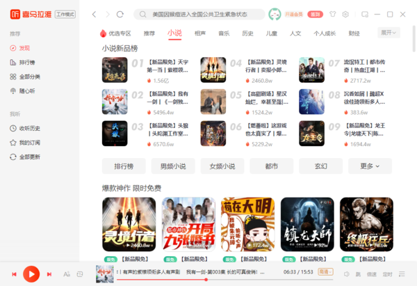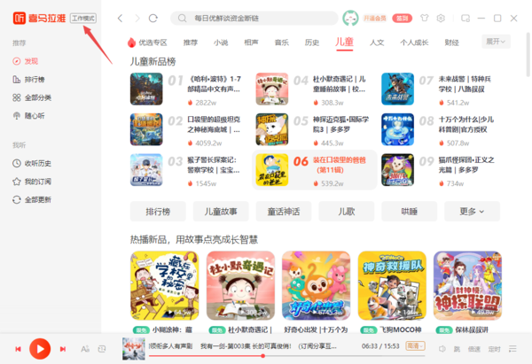 启动电脑上的喜马拉雅PC版软件,在软件主界面顶部的左上角位置,我们便可以看到一个【工作模式】的选项,点击它,我们就可以进入到喜马拉雅的工作模式当中了。